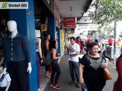 Na manhã desta quarta-feira, 5 de abril, os servidores da base do Sintef-GO foram responsáveis pela “Tenda Nenhum Direito a Menos”, instalada na Praça do Bandeirante, no centro de Goiânia, pelo Fórum Goiano Contra as Reformas da Previdência e Trabalhista. Ao microfone, os membros da equipe se revezaram para denunciar todos os ataques à classe trabalhadora, especialmente o massacre imposto à população que possui menor renda e escolaridade mais baixa. Centenas trabalhadores, aposentados, pessoas desempregadas e estudantes receberam esclarecimentos sobre os projetos do governo Temer.