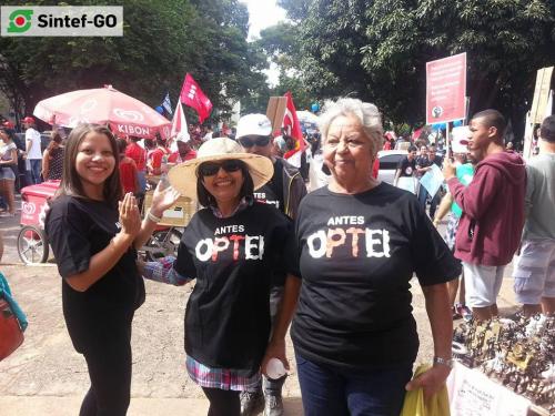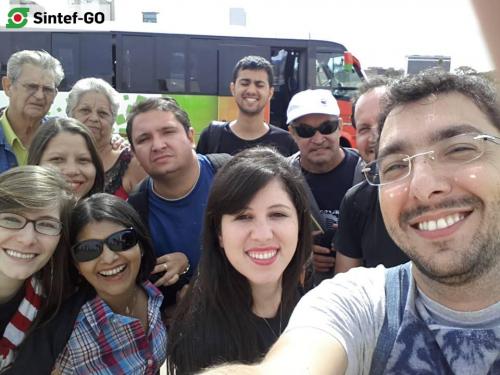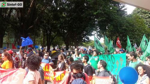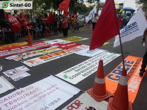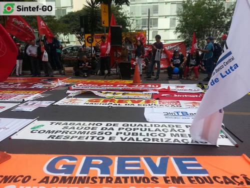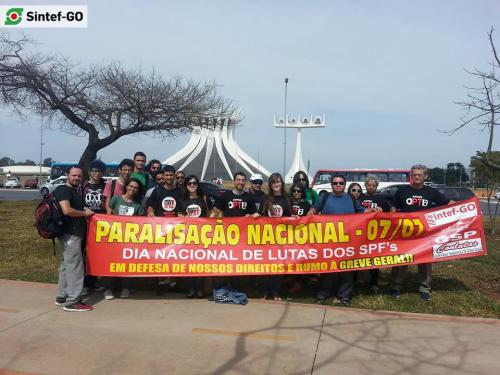 Servidores do IFG presentes na “Marcha Unificada dos Servidores Públicos Federais”, em Brasília, em 6 de agosto de 2015. O grupo do Sintef-GO somou-se ao SINASEFE, ANDES-SN, FASUBRA e demais sindicatos para pressionar o governo federal. A manifestação objetivou mostrar ao governo federal a disponibilidade de luta das diversas categorias do funcionalismo federal, e também cobrar a retomada das negociações em torno da pauta unificada apresentada pelo Fórum das Entidades Nacionais dos Servidores Públicos Federais.