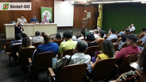 No início do mês, o Sintef-GO promoveu um debate sobre o atual cenário político brasileiro e seus desdobramentos, com participação dos professores Marcelo Lira (IFG), Walmir Barbosa (IFG) e David Maciel (UFG). O debate foi realizado no Miniauditório Demartin Bizerra, localizado no Câmpus Goiânia do IFG.