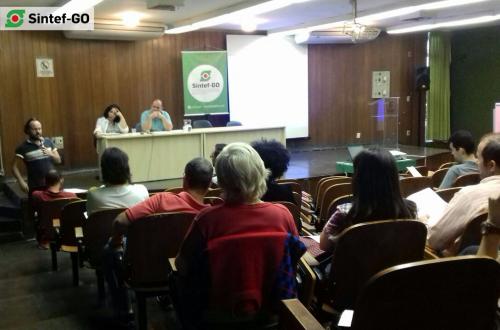 No início do mês, o Sintef-GO promoveu um debate sobre o atual cenário político brasileiro e seus desdobramentos, com participação dos professores Marcelo Lira (IFG), Walmir Barbosa (IFG) e David Maciel (UFG). O debate foi realizado no Miniauditório Demartin Bizerra, localizado no Câmpus Goiânia do IFG.