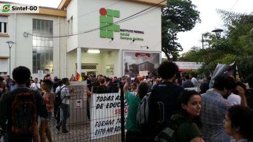 Servidores e estudantes se reuniram no Câmpus Goiânia do IFG para alertar e mobilizar a comunidade acadêmica contra os ataques investidos pelo governo Temer e pelo governo estadual de Marconi Perillo. Promovida pelo Sintef-GO, a atividade ocorreu em três turnos e integrou o movimento de luta nacional chamado pelas centrais sindicais para este dia. Ao microfone, foi divulgada sistematicamente a Carta de Vitória, publicada durante a 40ª Reunião dos Dirigentes das Instituições Federais de Educação Profissional e Tecnológica – Reditec, em Vitória (ES). O documento traz críticas sobre cinco temas específicos: a reforma do Ensino Médio; o PLP 257, que cria programa de demissão voluntária e impede o cumprimento dos planos de carreira dos servidores públicos; a PEC 241, que congela o orçamento da saúde, da educação e outros investimentos públicos por vinte anos; o quadro orçamentário e financeiro de 2016; e a Lei Orçamentária Anual – LOA 2017.