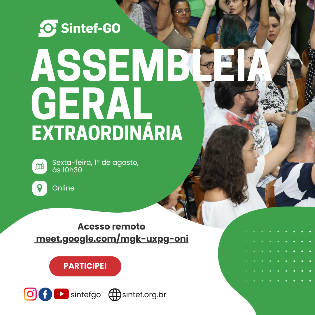A Direção Geral do Sintef-GO convoca suas filiadas e seus filiados e a comunidade em geral do IFG e do IF Goiano para a participação em sua Assembleia Geral Extraordinária online, a ser realizada no dia 1º de agosto de 2025, sexta-feira, às 10h30.
