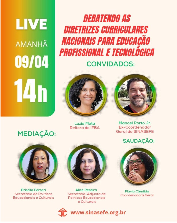 Nesta quinta-feira (09/04), às 14h, o SINASEFE realiza uma transmissão ao vivo via Canal do YouTube e via página do Facebook. As Diretrizes Curriculares Nacionais para Educação Profissional e Tecnológica estarão em debate, sob a mediação da Coordenação de Políticas Educacionais e Culturais da entidade (Priscila Ferrari e Alice Pereira). A atividade contará com a … Ler mais…