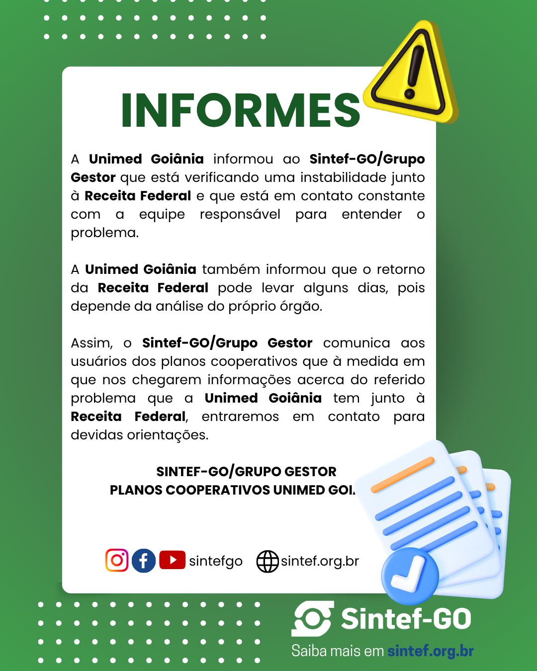 O Sintef-GO, após a identificação de divergências de informações a respeito de despesas médicas para declaração de Imposto de Renda 2025, manteve contatos junto à Unimed Goiânia para a compreensão das referidas divergências. Após condução de tratativas com à Unimed Goiânia, com vista ao saneamento do problema, a Unimed Goiânia nos informou que realizou a … Ler mais…