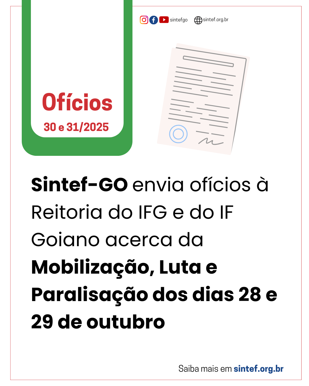 Sintef-GO envia ofícios à Reitoria do IFG e do IF Goiano acerca da Mobilização, Luta e Paralisação dos dias 28 e 29 de outubro