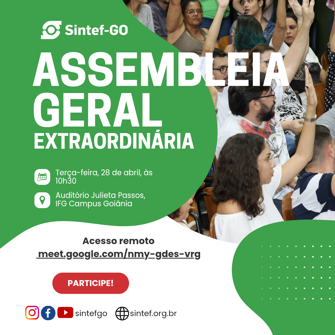A Direção Geral do Sintef-GO convoca suas filiadas e seus filiados e à comunidade em geral do IFG e do IF Goiano para a realização de sua Assembleia Geral Extraordinária híbrida, no dia 28 de abril de 2026 (terça-feira). A Assembleia terá início às 10h30. A Assembleia ocorrerá no Auditório Julieta Passos, localizado no Câmpus … Ler mais…